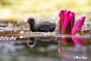 Dusky Moorhen chick with bright Lilly